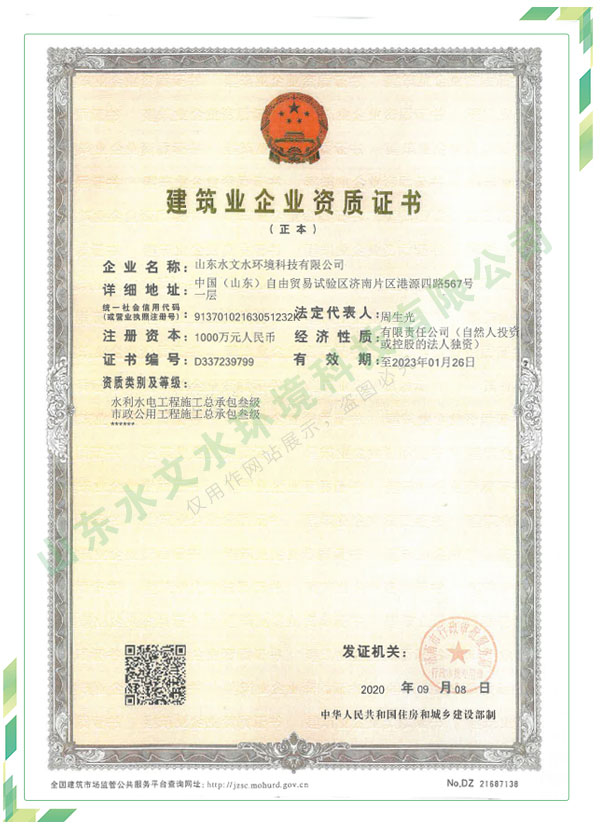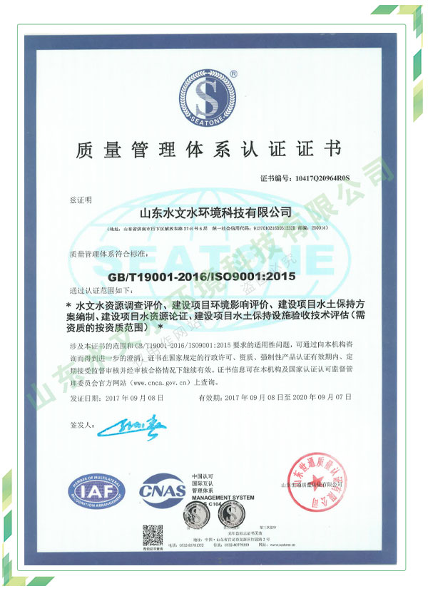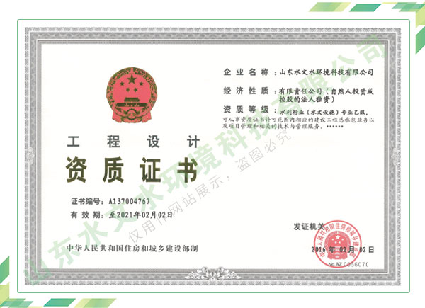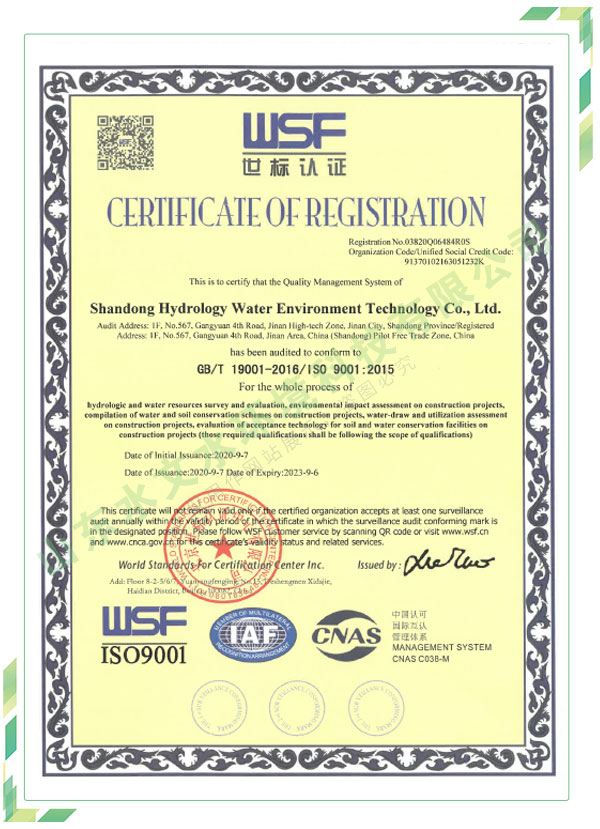 公司擁有水利工程設(shè)計(jì)、水土保持、水文水資源調(diào)查評價、水資源論證、建設(shè)項(xiàng)目環(huán)境影響評價、市政公用工程施工總承包、水利水電工程施工總承包、電子與智能化工程專業(yè)承包等資質(zhì),2017年通過質(zhì)量管理體系、環(huán)境管理體系、職業(yè)健康安全管理體系認(rèn)證;2020年被評為國家級高新技術(shù)企業(yè),同年被中國水利企業(yè)協(xié)會推薦為第一批“合同節(jié)水服務(wù)企業(yè)”;2021年被山東省、濟(jì)南市評為 “專精特新”中小企業(yè)。業(yè)務(wù)范圍涉及水利工程設(shè)計(jì);節(jié)水設(shè)計(jì)、改造、水平衡測試;山洪災(zāi)害調(diào)查;城市水資源調(diào)查評價;建設(shè)項(xiàng)目水土保持方案編制、監(jiān)測、驗(yàn)收、水土保持規(guī)劃;水安全保障規(guī)劃、建設(shè)項(xiàng)目水資源論證、規(guī)劃水資源論證;建設(shè)項(xiàng)目環(huán)境影響評價;入河排污口論證;防洪影響評價;市政公用工程施工、水利水電工程施工、電子與智能化工程施工等。